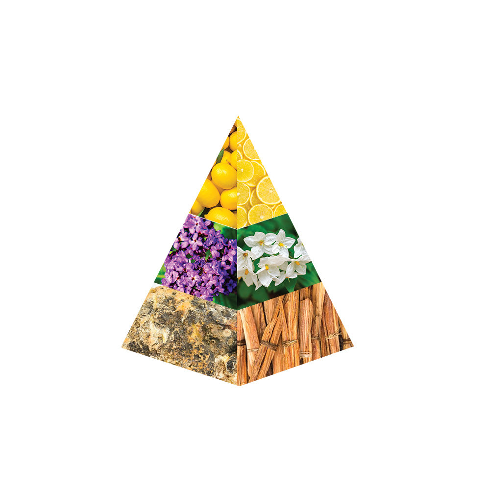 A fresh fusion of green notes, incense, and lemon opens this elegant scent. The heart reveals a soft floral blend of heliotrope, jasmine, and orris, resting on a warm, sensual base of ambergris, guaiac wood, and musk creating a serene and luxurious atmosphere.