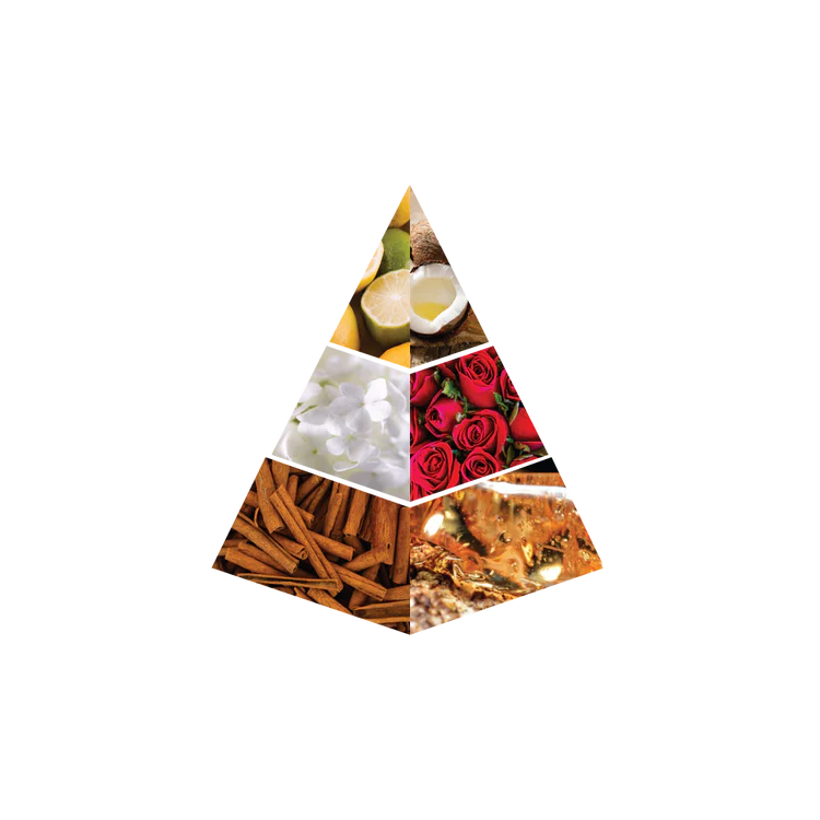 The base is warm and sensual, with deep notes of musk, vanilla, sandalwood, and ambergris, creating a rich, comforting finish. A perfect balance of freshness, florals, and warmth.