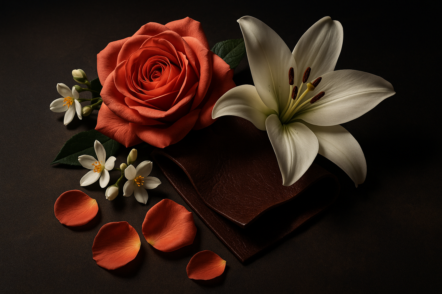 Its heart unfurls in opulent whispers rose and jasmine bloom with regal grace, while a touch of leather and lily weave shadows of intrigue, a dance of softness and strength.